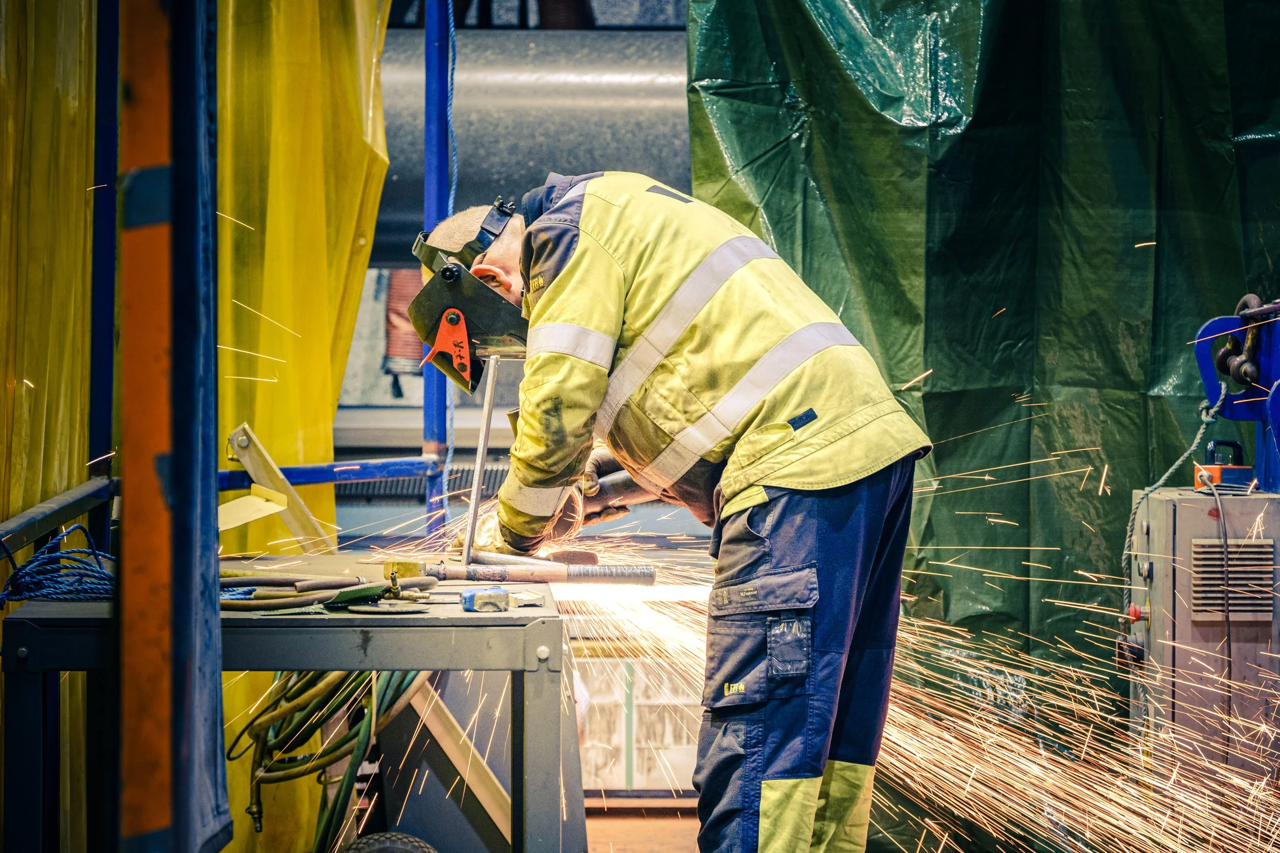 A worker welding metal with sparks flying in an industrial workshop.